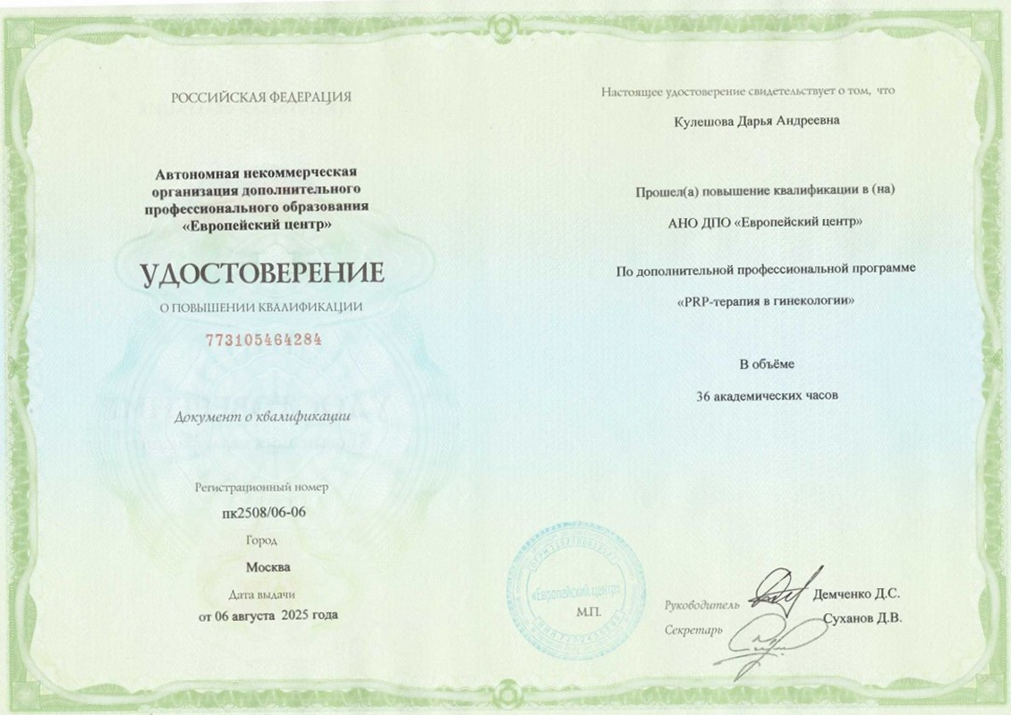 2025 г. – повышение квалификации на базе АНО ДПО «Европейский центр» (г. Москва) по программе «PRP-терапия в гинекологии».