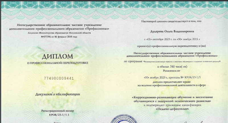 - - прошла профессиональную переподготовку на базе НОЧУ ДПО «Профессионал» (г. Серпухов), квалификация – педагог-дефектолог.