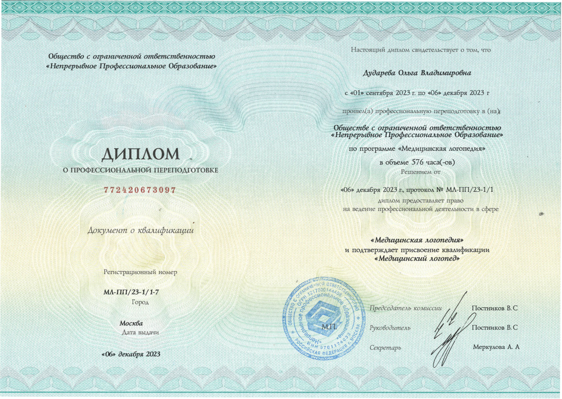 - - прошла профессиональную переподготовку на базе ООО «Непрерывное профессиональное образование» (г. Москва), квалификация – медицинский логопед.