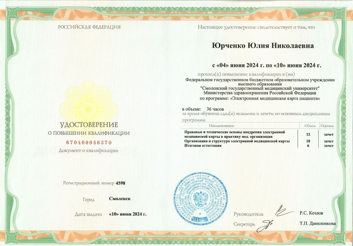2024 г. – повышение квалификации на базе Смоленского государственного медицинского университета по программе «Электронная медицинская карта пациента».