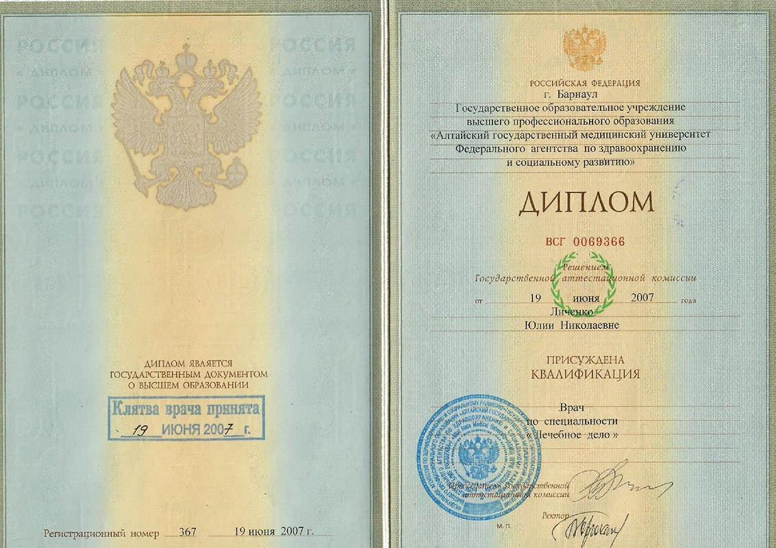 2008 г. – окончила интернатуру на базе Алтайского государственного медицинского университета по специальности неврология.