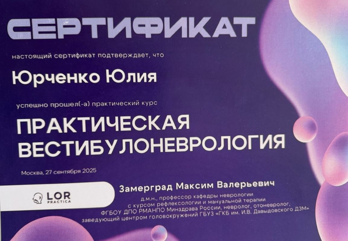 2025 г. – прошла практический курс Замеграда Максима Валерьевича д.м.н. профессора кафедры неврологии с курсом рефлексологии и мануальной терапии ФГБОУ ДПО РМАНПО Минздрава России, невролога, отоневролога, заведующего центром головокружений ГБУЗ «ГКБ им. И.В. Давыдовского ДЗМ» по теме «Практическая вестибулоневрология».
