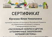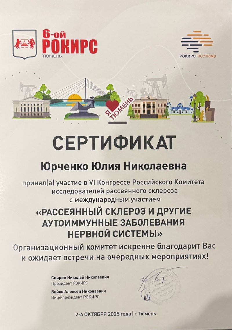 2025 г. – участие в VI Конгрессе Российского Комитета исследователей рассеянного склероза с международным участием по теме «Рассеянный склероз и другие аутоиммунные заболевания нервной системы».