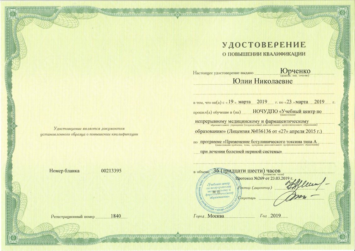 2022 г. – повышение квалификации на базе НОЧУ ДПО «Учебный центр по непрерывному медицинскому и фармацевтическому образованию» (г. Москва) по программе «Применение ботулинического токсина типа А при лечении болезней нервной системы».