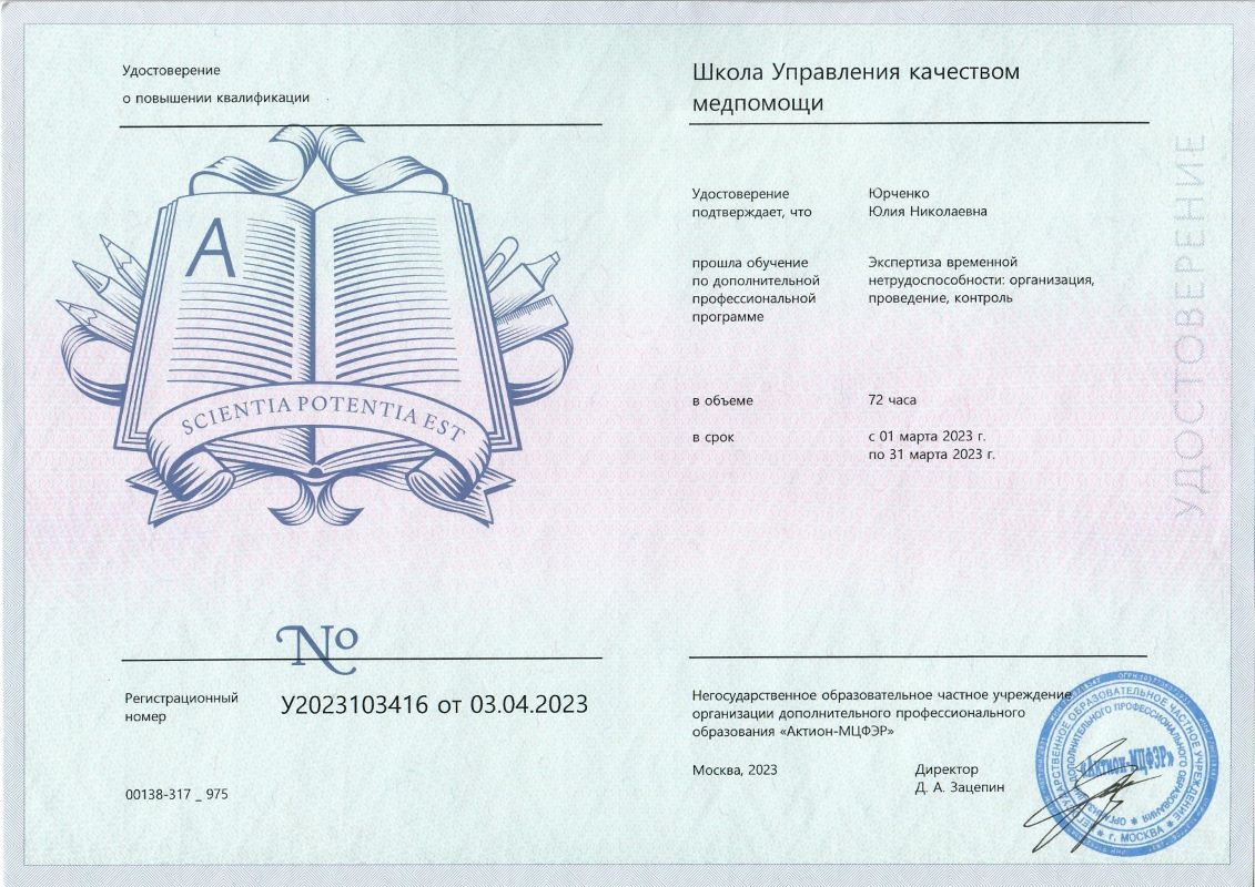 2023 г. – повышение квалификации на базе Негосударственного образовательного частного учреждения организации дополнительного профессионального образования «Актион-МЦФЭР (г. Москва) по программе «Экспертиза временно нетрудоспособности: организация, проведение, контроль».