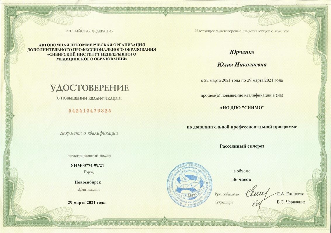 2021 г. – повышение квалификации на базе АНО ДПО «Сибирский институт непрерывного медицинского образования» (г. Новосибирск) по программе «Рассеянный склероз».