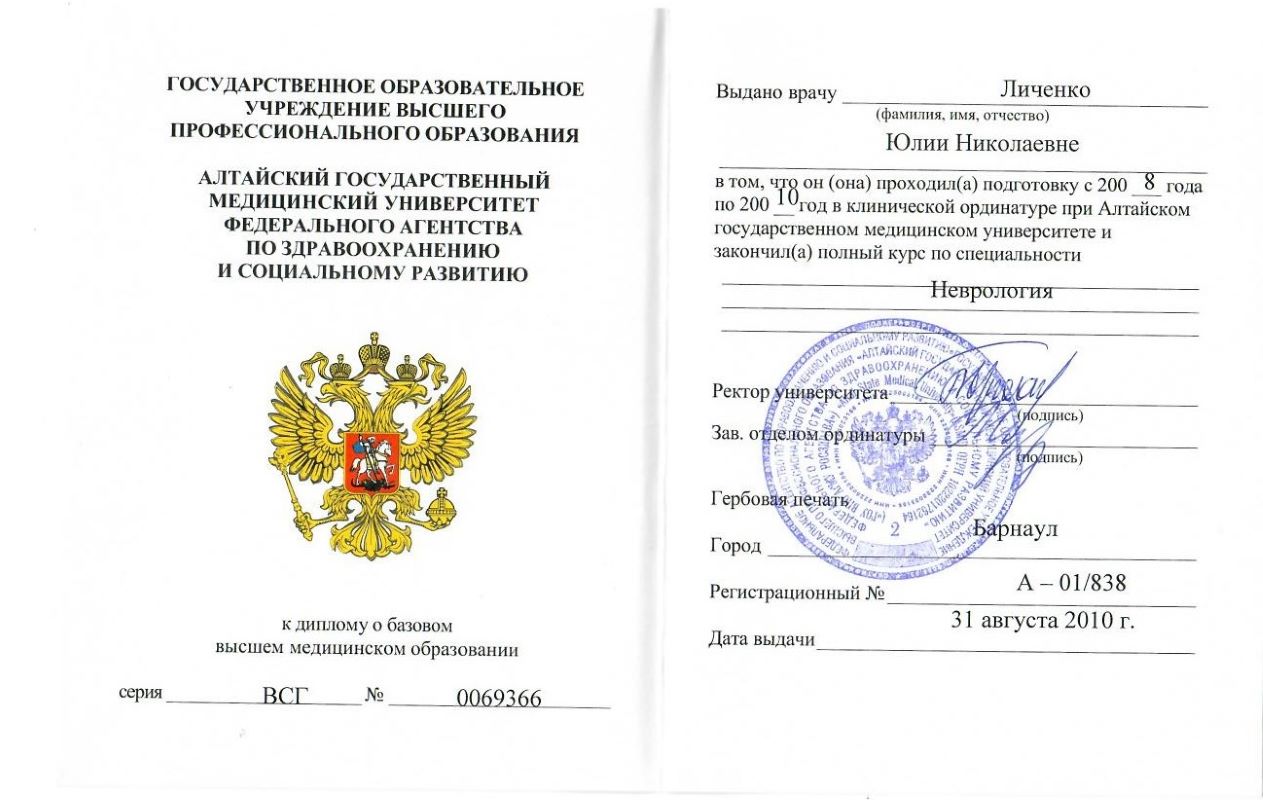 2010 г. – окончила ординатуру на базе Алтайского государственного медицинского университета по специальности неврология.