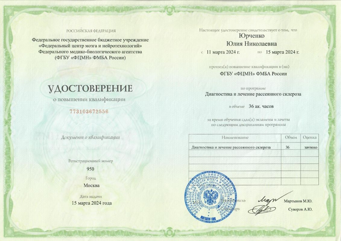 2024 г. – повышение квалификации на базе ФГБУ «Федеральный центр мозга и нейротехнологий» Федерального медико-биологического агентства (г. Москва) по программе «Диагностика и лечение рассеянного склероза».