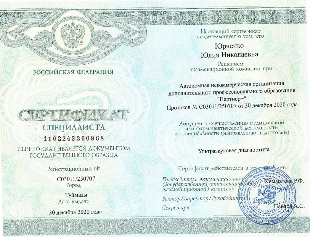 Сертификат по специальности ультразвуковая диагностика действителен до 30.12.2025 г.